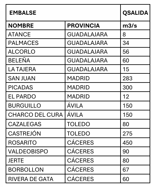 En cuanto a los embalses que están desembalsando con caudales significativos (QSALIDA) en la demarcación a fecha y hora de emisión de esta nota de prensa: