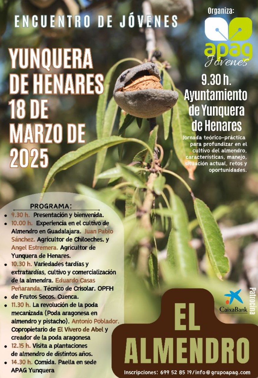 Hoy martes 18 de marzo se celebrará una jornada técnica sobre el cultivo del almendro, organizada por la sectorial joven de APAG. La jornada contará con una parte teórica, la cual se desarrollará en el Ayuntamiento de Yunquera de Henares y una parte práctica de visita a plantaciones.