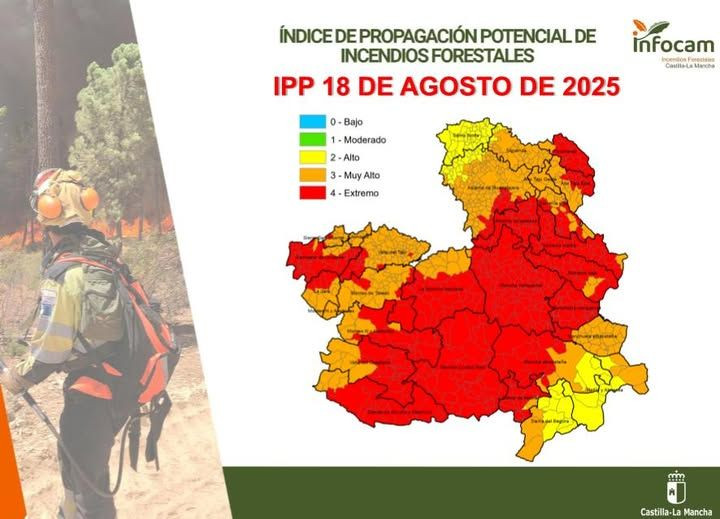 Según información del Plan Infocam relativa al Índice de Propagación Potencial de incendios forestales, este lunes, 18 de agosto, existe un riesgo extremo (rojo) en buena parte del Señorío de Molina, en la provincia de Guadalajara, en el extremo este de Toledo, en una parte importante de Ciudad Real, Cuenca y Toledo y en la mitad este de Albacete; riesgo muy alto (naranja) en la Sierra Norte de Guadalajara, en casi toda la Alcarria y en prácticamente el resto de la región; y alto (amarillo) en la parte este de la Sierra Norte y en el sureste de la provincia de Albacete.