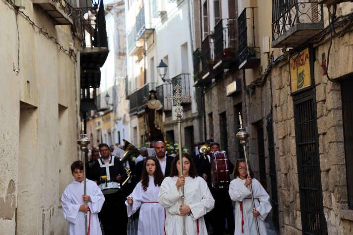 Tras la misa, la imagen de Santa Teresa recorrió en procesión las calles de Pastrana, portada por fieles y acompañada por la Banda de Música de Robledo de Chavela, dirigida por Daniel Pareja. El cortejo avanzó por la Calle Mayor y la Plaza de la Hora, pasando ante la calle Santa Teresa de Jesús -La Castellana- y la Plaza de los Cuatro Caños antes de regresar a la Colegiata, en un itinerario que evocó los pasos fundacionales de la Santa por la villa.