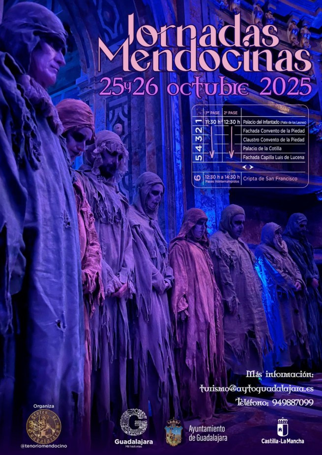 Un año más, y como es tradición, las Jornadas Mendocinas regresan a las calles de la ciudad organizadas por la concejalía de Turismo del Ayuntamiento de Guadalajara, en colaboración con la Asociación Gentes de Guadalajara. Un recorrido por los monumentos de la familia Mendoza, que sirve como aperitivo para el plato fuerte de la semana que viene: La representación de la XXXV edición del Tenorio Mendocino.