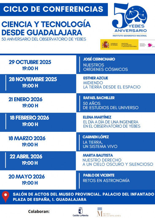 Tras el acto inaugural del cincuentenario, este pasado lunes, con la presencia del ministro de Transportes y Movilidad Sostenible, Óscar Puente, para hoy está programada la conferencia titulada “Nuestros orígenes cósmicos”, a cargo de José Cernicharo, del departamento de Astrofísica Molecular e Infrarroja del Instituto de Estructura de la Materia (IEM) del Consejo Superior de Investigaciones Científicas (CSIC). Será a las 19 horas en el salón de actos del palacio del Infantado.