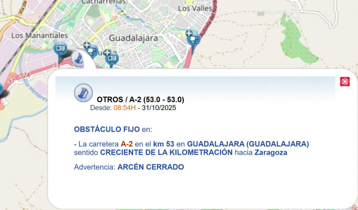 La Dirección General de Tráfico (DGT) ha avisado a través de sus perfiles en redes sociales de un accidente producido en la A-2, en el kilómetro 53, sentido Zaragoza, en Guadalajara.
