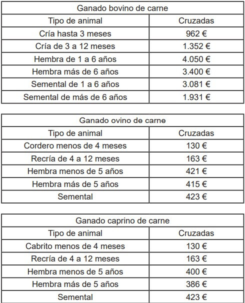 Para todas las especies, en el caso de razas puras (demostrado documentalmente mediante inscripción del animal muerto en los libros de registro, o de la madre en el caso de terneros, corderos o cabritos sin crotal) su valor será el resultado de multiplicar por 1,5 los valores recogidos en las tablas. En el caso del ganado ovino o caprino para producción de leche su valor será el resultado de multiplicar los distintos valores de los animales de carne por 1,5.