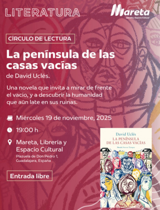 El próximo miércoles, 19 de noviembre, a partir de las 19.00 horas, Mareta acogerá un nuevo evento. En dicho centro cultural, situado en la plazuela de don Pedro, 1C, de Guadalajara (España), se ha previsto el análisis de «La península de las casas vacías», de David Uclés. Todo ello, bajo el formato de club de lectura, al que están invitados la totalidad de arriacenses. Durante la cita intervendrá el historiador y periodista Julio Martínez, quien fungirá de dinamizador de la idea, a la vez que ofrecerá un contexto de la misma.