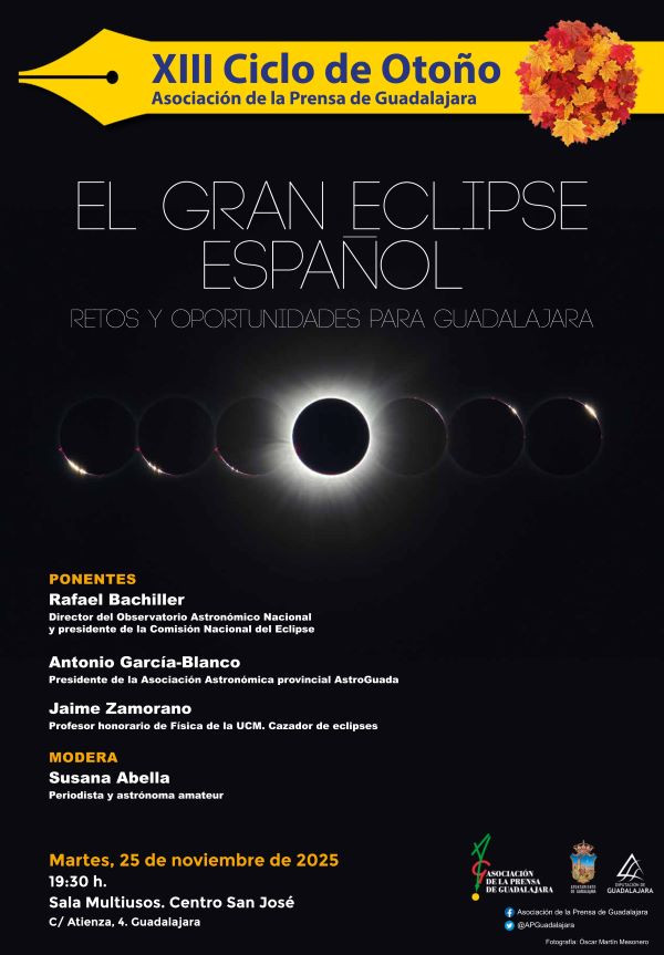 La primera mesa coloquio tendrá lugar el martes 25 de noviembre a las 19:30 horas, bajo el título “El Gran Eclipse Español. Retos y oportunidades para Guadalajara”. El encuentro girará en torno al eclipse solar total que tendrá lugar el próximo verano, un fenómeno astronómico de gran relevancia científica y turística. Participarán como ponentes Rafael Bachiller, director del Observatorio Astronómico Nacional y presidente de la Comisión Nacional del Eclipse; Antonio García-Blanco, presidente de la Agrupación Astronómica de Guadalajara (AstroGuada); y Jaime Zamorano, profesor honorario de la UCM y reconocido cazador de eclipses. La mesa estará moderada por la periodista y astrónoma amateur Susana Abella.