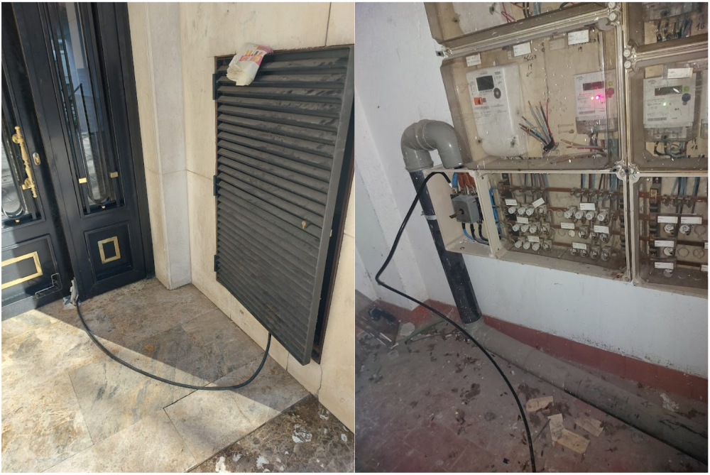 Una suerte de chapuza que mantiene conectada la luz a través de un cable, con las puertas de la sala de contadores y del portal abiertas necesariamente, y atravesando un patio, tal y como se puede ver en el vídeo que adjuntamos en esta información y que los vecinos valoran como una instalación precaria que puede volver a fallar en cualquier momento y que entraña problemas de seguridad en el edificio.