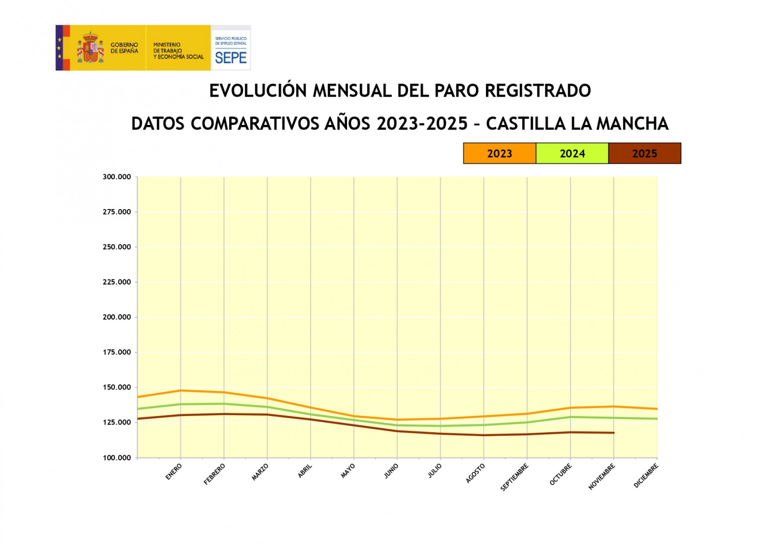En el conjunto de Castilla-La Mancha, el paro bajó ligeramente un 0,30%, con 349 desempleados menos y un total de 117.792 personas inscritas en las listas del Sepecam. Sin embargo, el paro baja un 8,28% con respecto a noviembre de 2024, con 10.632 personas menos sin empleo.