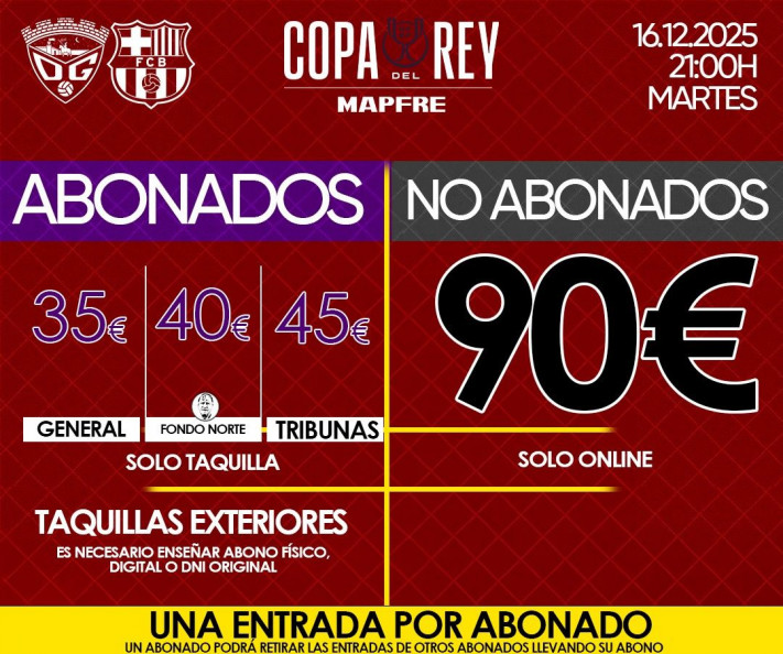 La venta en taquillas es sólo para los abonados -que tienen asegurados sus asientos- y pueden adquirirse por 35 euros la general, 40 euros el fondo norte y 45 euros las tribunas. Sólo se venderá una entrada por abono aunque sí se podrán retirar con más abonos de conocidos para evitar desplazamientos innecesarios y el colapso de la zona. Será necesario presentar el abono físico o digital o el DNI original.