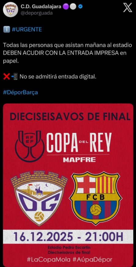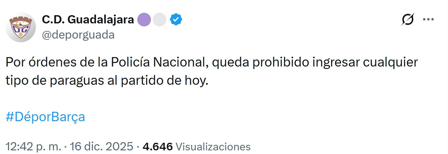 Según informan desde las redes sociales del C.D Guadalajara: "Por órdenes de la Policía Nacional, queda prohibido ingresar cualquier tipo de paraguas al partido de hoy". Además, también informan de que "Todas las personas que asistan al estadio DEBEN ACUDIR CON LA ENTRADA IMPRESA EN PAPEL".