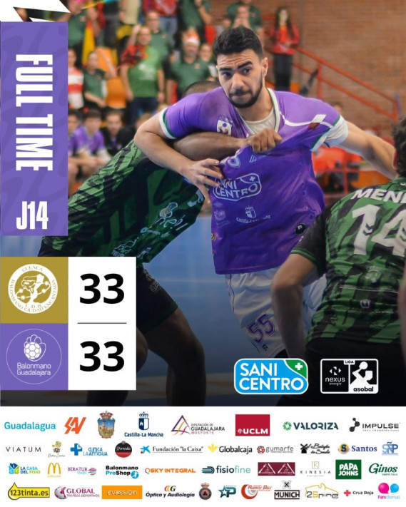 El SANICENTRO Balonmano Guadalajara volvió a demostrar anoche que atraviesa su mejor momento competitivo de la temporada. En un derbi intenso, igualado y cargado de emoción, los de Juan Carlos Requena sumaron un valioso empate en la pista del REBI Cuenca (33-33), un resultado que sabe a mucho más que un punto por la entidad del rival, el escenario y el desarrollo del encuentro.