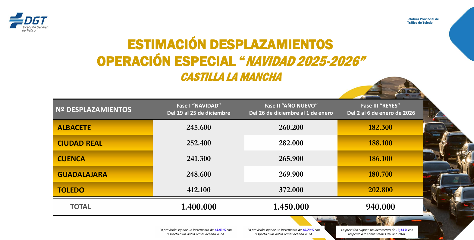 En Castilla-La Mancha la Dirección General de Tráfico prevé un total de 3.790.000 desplazamientos. En la fase de Navidad, del 19 al 25 de diciembre, se esperan 1,4 millones de viajes; en la fase de Año Nuevo, del 26 de diciembre al 1 de enero, la cifra asciende a 1,45 millones; y en la fase de Reyes, del 2 al 6 de enero, se contabilizarán alrededor de 940.000 desplazamientos. Si se observa el conjunto de periodos, entre el 19 y el 31 de diciembre se producirán 2.316.504 movimientos, mientras que entre el 1 y el 6 de enero se sumarán 1.473.496, lo que confirma que la semana de Año Nuevo será la de mayor intensidad en las carreteras de la región.