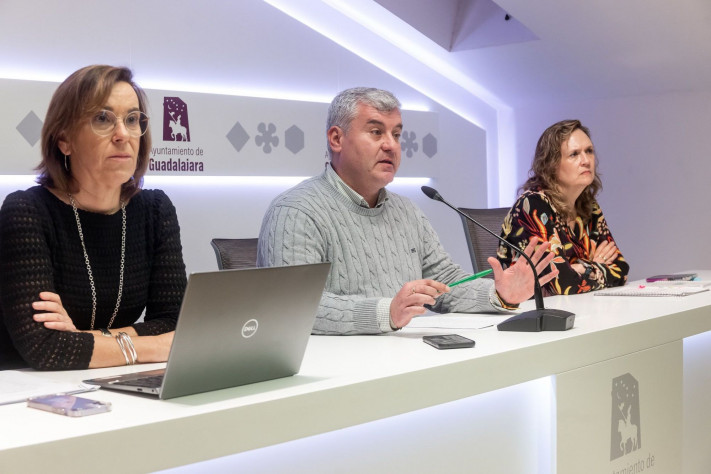 El concejal de Urbanismo del Ayuntamiento de Guadalajara, Alfonso Esteban, acompañado por la Jefa de Área y la Jefa de Servicio de Urbanismo, Blanca Causapié y María Jesús García, ha ofrecido una comparecencia para despejar cualquier duda sobre el procedimiento seguido por el Ayuntamiento en relación con las gradas supletorias instaladas en el Pedro Escartín.