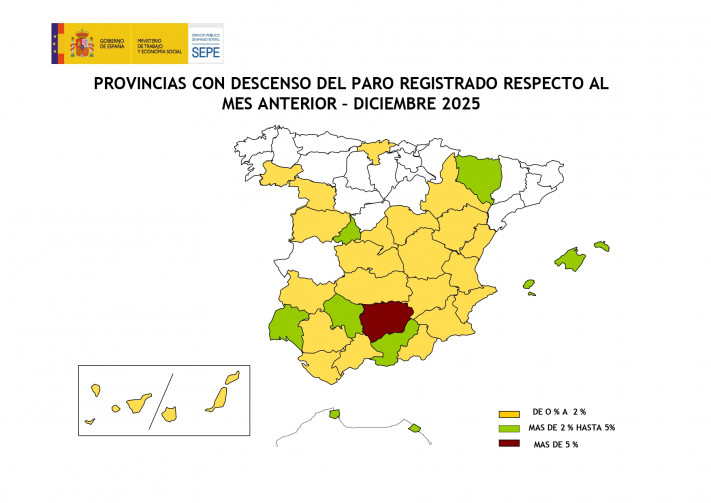 El paro registrado en diciembre de 2025 baja en 10 Comunidades Autónomas. Las mayores caídas en cifras absolutas se producen en: Andalucía (-12.271 personas), Comunidad Valenciana (-2.173 personas) y Comunidad de Madrid (-1.504 personas).