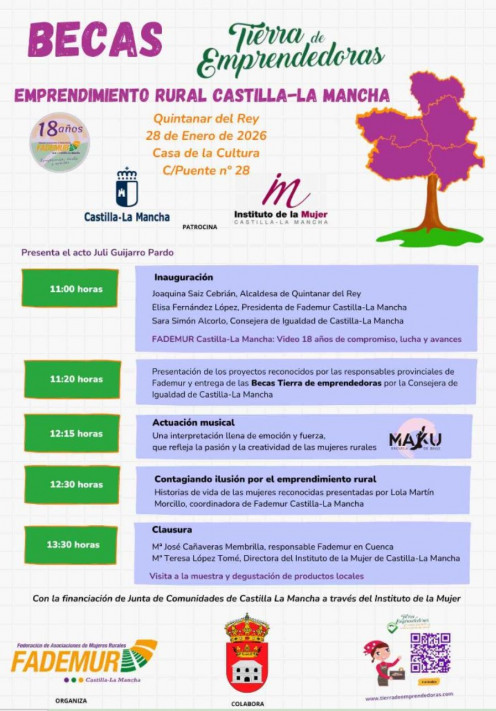Reivindicar el talento emprendedor de las mujeres rurales de Castilla-La Mancha, sus proyectos, iniciativas e ideas es una de las bases de los reconocimientos y becas al emprendimiento rural en Castilla-La Mancha. Estas becas se entregarán mañana en la localidad conquense de Quintanar del Rey a partir de las 11:00 horas en la Casa de la Cultura.