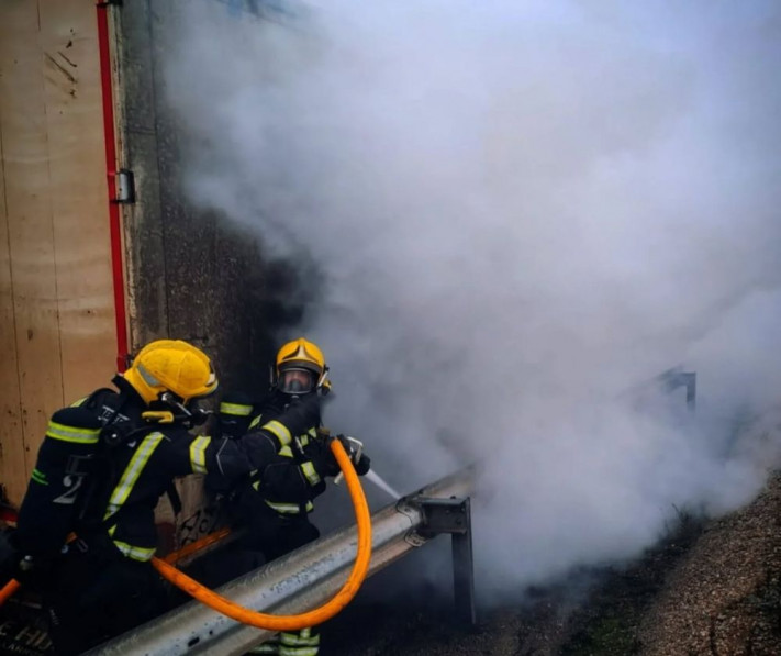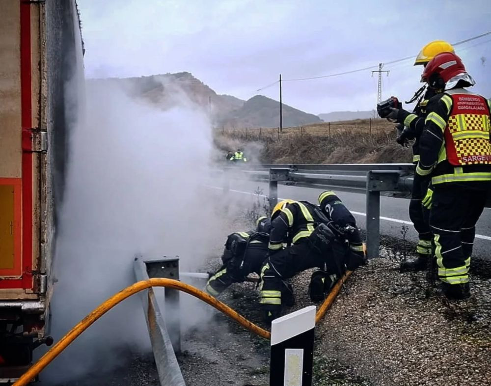 Según informan los bomberos de Guadalajara, se desplazan al accidente dos dotaciones, que se encuentran a su llegada un semirremolque ardiendo en su parte trasera por las ruedas, en el arcén de la carretera.