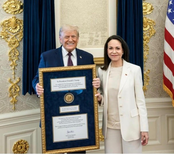"Presentado como un símbolo personal de gratitud en nombre del pueblo venezolano en reconocimiento a la acción decisiva del presidente Trump para asegurar una Venezuela libre. El coraje de Estados Unidos y de su presidente jamás será olvidado por el pueblo venezolano".