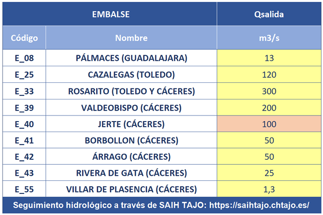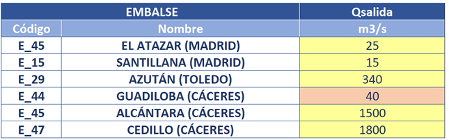 Las siguientes presas gestionadas por concesionarios en la cuenca del Tajo se encuentran desembalsando significativamente: