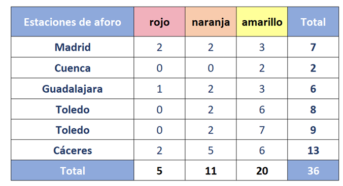 Según la información facilitada por el organismo, dependiente del Ministerio para la Transición Ecológica y el Reto Demográfico, en el conjunto de la cuenca del Tajo permanecen activos 36 avisos hidrológicos, cinco de ellos en nivel rojo. Entre estos se encuentra el registrado en Guadalajara, junto a otros localizados en Madrid y Cáceres.