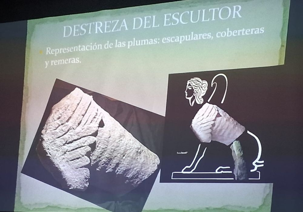 La esfinge, recordaba el experto, es un animal mitológico con la cabeza de mujer, que no se ha conservado, pero sí los restos de un mechón de pelo, que se encuentra entre el cuello y el ala izquierda y tiene alas de ave y el cuerpo de leona, donde se marcan perfectamente las costillas y las mamas: “En este caso, la esfinge tiene los cuatro pares de de mamas dispuestos a lo largo de todo el vientre. Realmente, en las leonas, estas se localizan en la parte baja del vientre, únicamente. Esto nos está remitiendo a que el modelo que tomaron para representar la esfinge, muy posiblemente fuera un gato, que evidentemente lo tendrían más a mano”, señala.