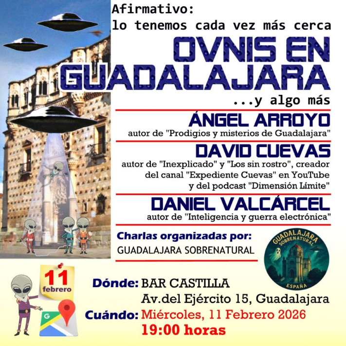 ¿Ha mirado alguna vez al cielo de Guadalajara y ha pensado que aquello no era un avión? Este miércoles 11 de febrero puede encontrar respuestas —o al menos nuevas preguntas— en la charla coloquio que acogerá el Bar Castilla (Avenida del Ejército, 15) a partir de las 19:00 horas.