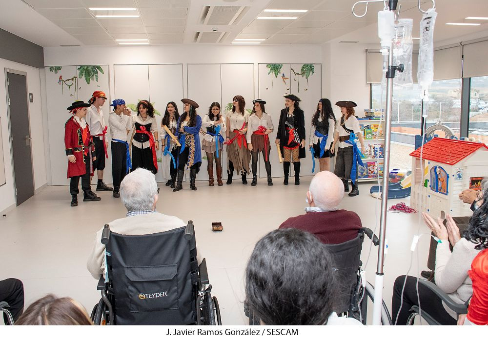 Seguidamente, alumnado de segundo de Bachillerato de Artes Escénicas del instituto Brianda de Mendoza ha ofrecido un fantástico espectáculo pirata. Han asistido tanto peques ingresados o en atención domiciliaria como mayores del Hospital de Día de Geriatría, que han disfrutado de la representación y los bailes y se han sumado con sus voces a interpretar varias canciones populares.