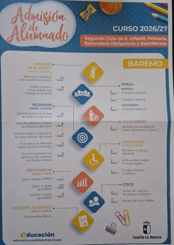 Los criterios del baremo siguen siendo los mismos: Hermanos matriculados en el centro, proximidad de domicilio familiar o lugar de trabajo; existencia de padre, madre o tutores legales en el centro; discapacidad del alumno o algún miembro de la familia; situación de acogimiento familiar del alumno; condición de víctima de violencia de género o terrorismo; alumnado nacido en parto múltiple; condición legal de familia numerosa; condición legal de familia monoparental; rentas anuales de la unidad familiar; y en el caso de Bachillerato, el expediente académico. “En todos estos criterios es fundamental marcar sí o no, porque si no no puedo pedir después que se tenga en cuenta ese criterio y entregar la documentación correspondiente al criterio o permitir a la Administración que pida la información a Hacienda o al organismo que corresponda”, advierte el delegado.