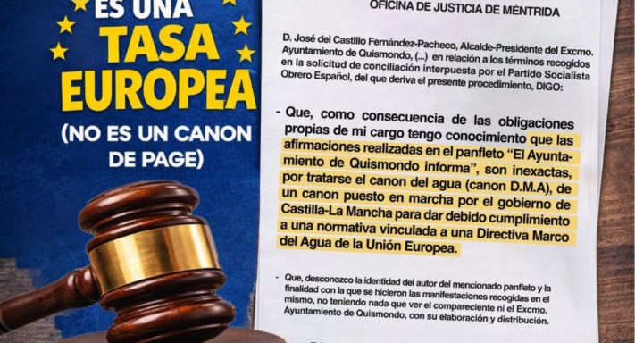 El regidor afirma textualmente: "Las afirmaciones realizadas en el panfleto 'El Ayuntamiento de Quismondo informa', son inexactas, por tratarse el canon del agua (canon DMA), de un canon puesto en marcha por el Gobierno de Castilla-La Mancha para dar debido cumplimiento a una normativa vinculada a una Directiva Marco del Agua de la Unión Europea".
