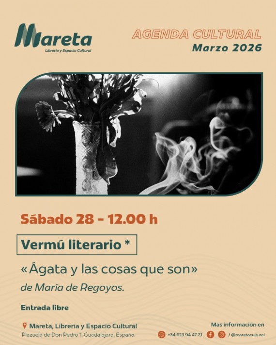 La escritora María de Regoyos va a protagonizar, este sábado, 28 de marzo –a partir de las 12.00 horas–, un vermú literario en Mareta, un espacio cultural situado en la plazuela de don Pedro, 1C, justo al lado del mercado de Abastos de Guadalajara (España). La propuesta tendrá será con el el libro «Ágata y las cosas que son », del que De Regoyos es autora. “La escribiente pondrá voz a fragmentos de la obra,”, explican los responsables de la actividad.