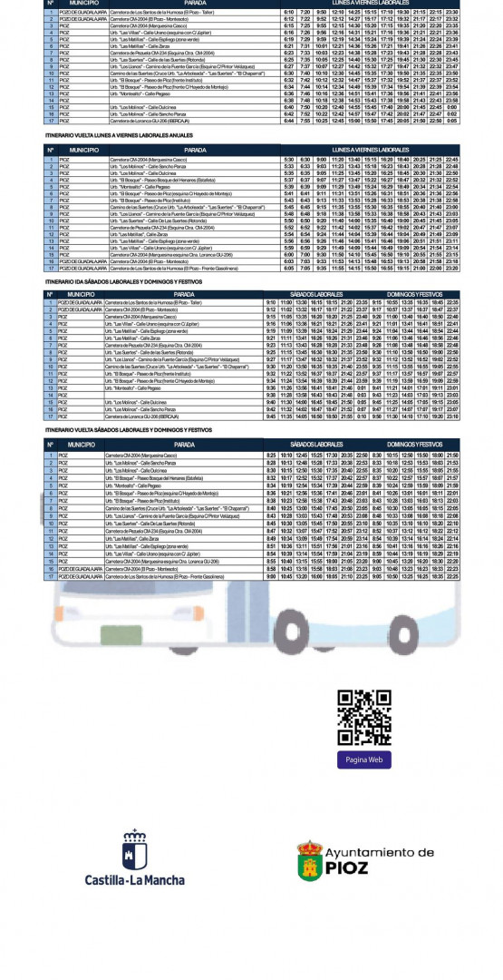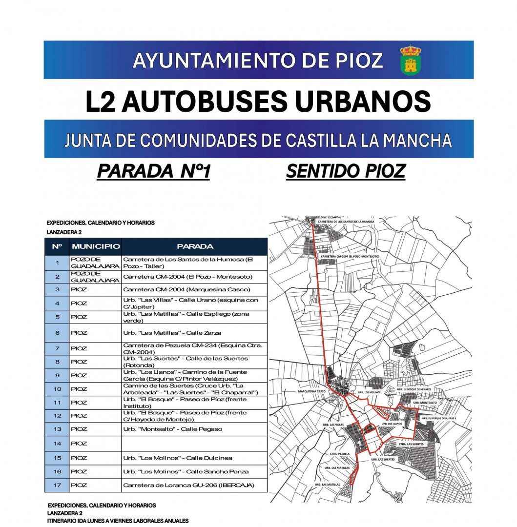 El nuevo servicio de transporte urbano de Pioz comenzará a funcionar a principios del mes de mayo con la puesta en marcha de las Líneas 1 y 2, que permitirán conectar el casco urbano con todas las urbanizaciones del municipio, además de facilitar los desplazamientos hacia Alcalá de Henares y Guadalajara. El horario será amplio, desde las 5:30 horas hasta las 23:40 horas, cubriendo así las principales franjas de movilidad diaria, especialmente las laborales.