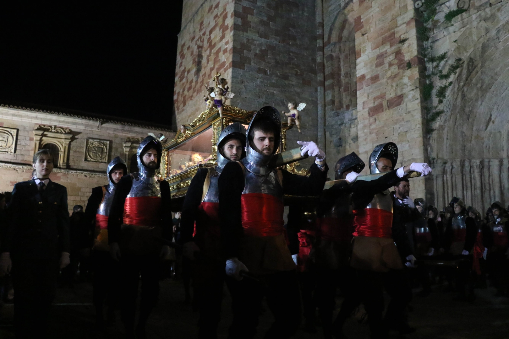 Al caer la noche, llega uno de los momento de mayor solemnidad, con la procesión Santo Entierro, también conocida como del Silencio. La nave central de la Catedral de Sigüenza es testigo del Descendimiento, como símbolo de la bajada del cuerpo de Jesucristo, una vez fallecido, de la cruz, para introducir después al Cristo Yacente en su urna. De allí parte en procesión, acompañado por la Virgen de la Soledad, primero completando una vuelta por la girola del templo y luego, por las calles de la ciudad, hasta la Ermita de San Lázaro, hoy convertida en la residencia de ancianos Saturnino López Novoa, donde se produce el momento del Recogimiento. Entonces, en medio de un silencio sepulcral, se llama con tres golpes a la puerte de la Ermita. Desde dentro alguien pregunta: “Quién va”, ante lo que el Hermano Mayor responde: “Jesús, El Nazareno, Rey de los Judíos”.